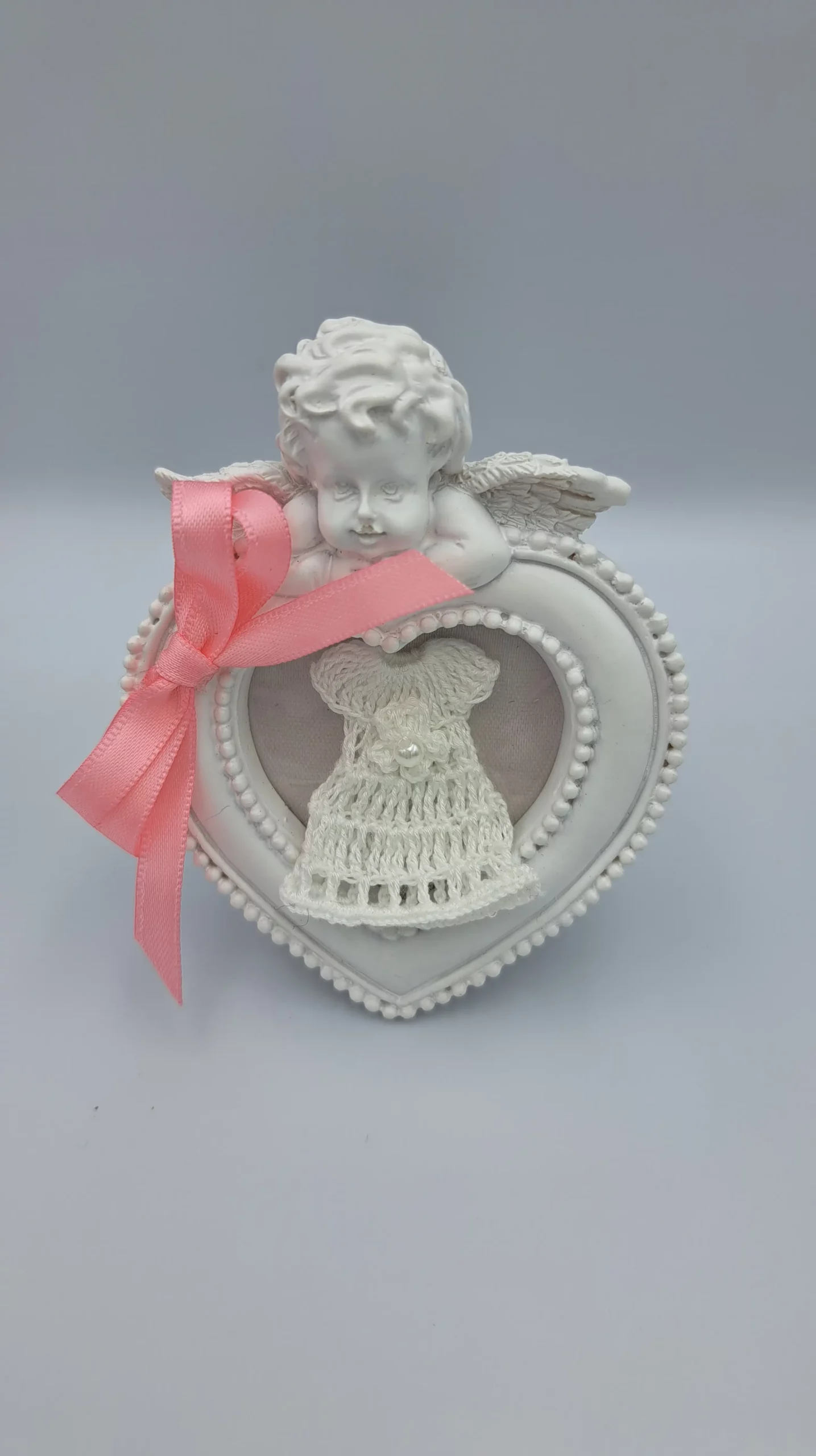 To serduszko z aniołkiem to piękna pamiątka z okazji narodzin lub Chrztu Świętego, która łączy w sobie delikatność i elegancję, idealna do upamiętnienia tego wyjątkowego dnia. Serduszko jest utrzymane w subtelnych kolorach bieli i różu, ma elegancki i delikatny wygląd, który wspaniale wpisuje się w uroczysty charakter chrztu. Ramka wykonana jest z gipsu, co nadaje jej trwałość oraz estetyczny, klasyczny wygląd. Całość ozdobiona jest atłasową wstążką, która dodaje serduszku wyrafinowanego akcentu.