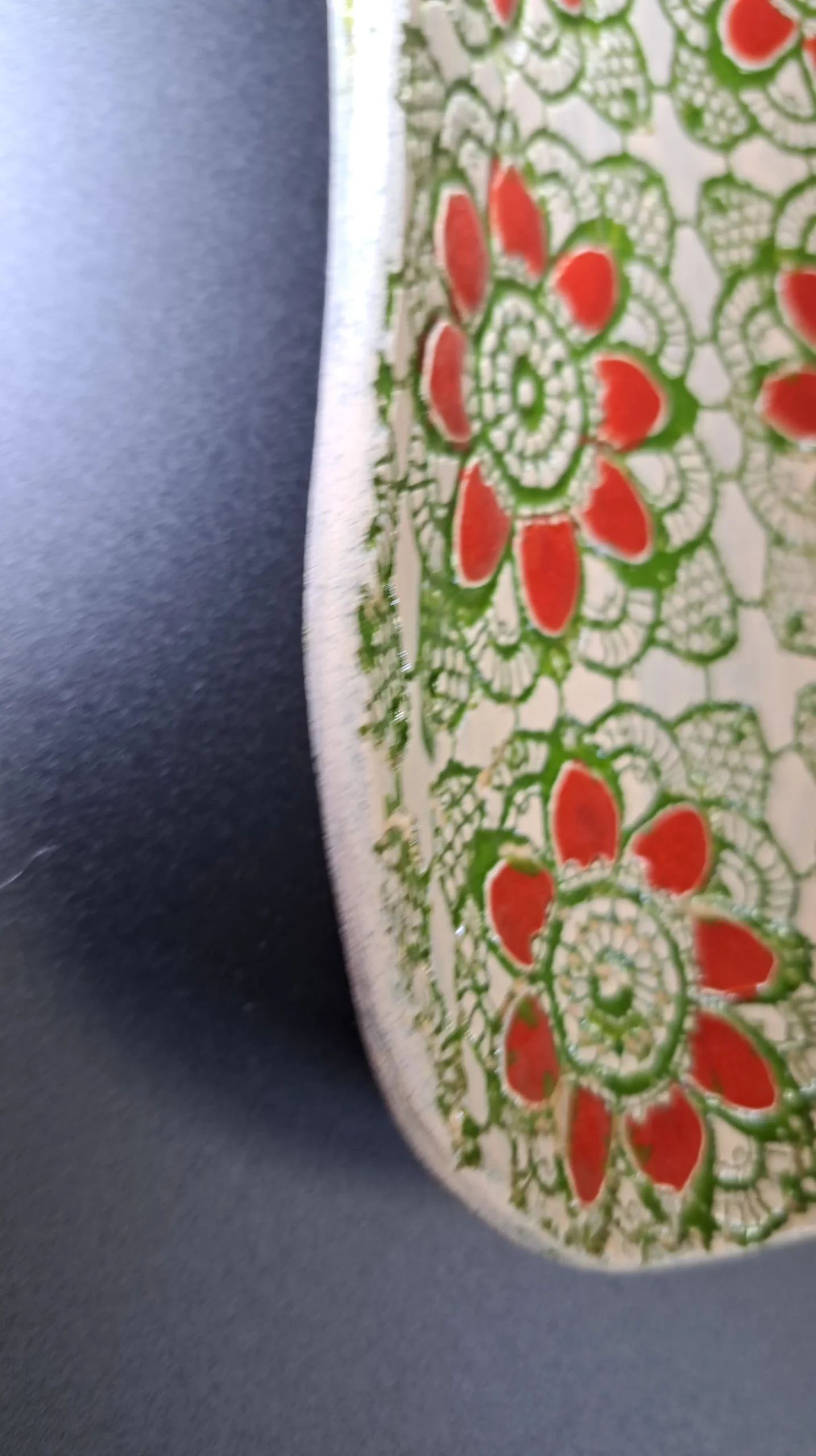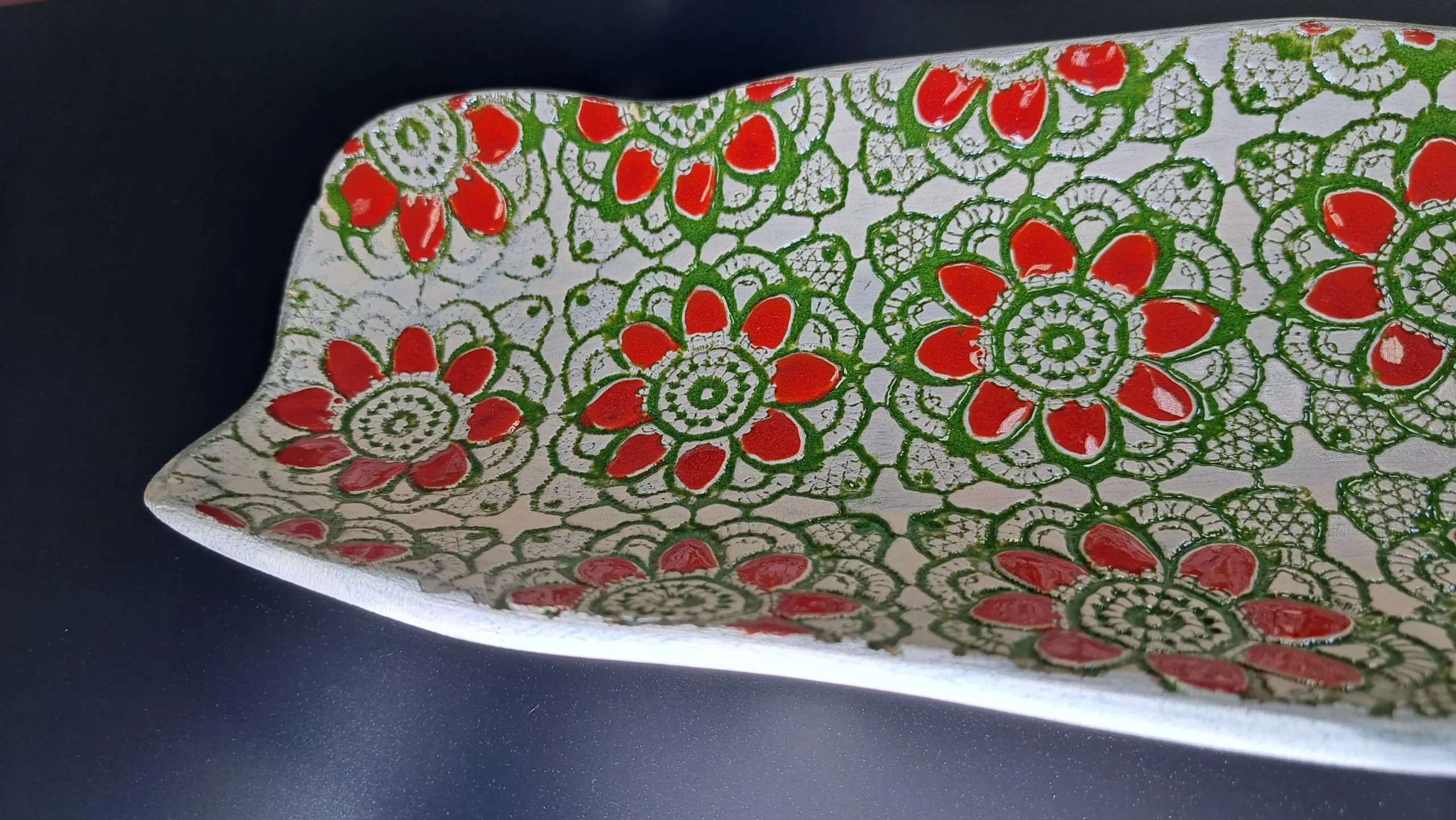 Półmisek ceramiczny o wymiarach 35 x 14 cm to elegancki i funkcjonalny element zastawy stołowej, który wyróżnia się swoim niebanalnym wzornictwem oraz wysoką jakością wykonania. Utrzymany w kolorach beżu, czerwieni i zieleni, półmisek zdobiony jest wzorem łączącym motywy kwiatowe z geometrycznymi, co nadaje mu unikalny, artystyczny charakter.