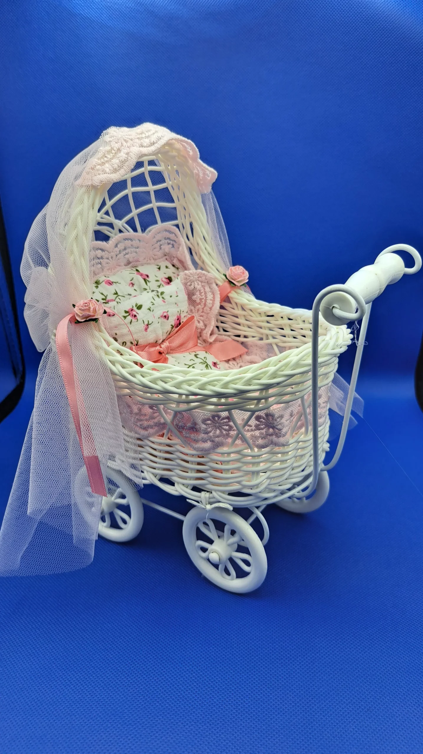 Wózeczek utrzymany jest w kolorach bieli, różu i kremowego, co nadaje mu subtelny, klasyczny wygląd. Materiały użyte do jego stworzenia to muślin, który dodaje całości lekkości i przyjemnej faktury, oraz satynowa wstążka, która delikatnie oplata wózek, dodając mu elegancji. Konstrukcja wózka wykonana jest z tworzywa sztucznego, co zapewnia trwałość i stabilność tej rękodzielniczej ozdoby.